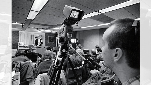 📸: Bill Sachse (left) and Connie Conrad assist Bill Sagal with their handcrafted Bucky Badger head. UW–Madison Archives, S040502