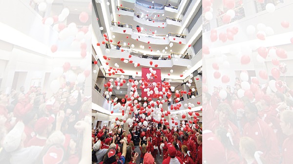 4. Alum Melissa Siems (BBA `96) grabs a photo with Bucky and her friend, Aimee Jo Castleberry (right).