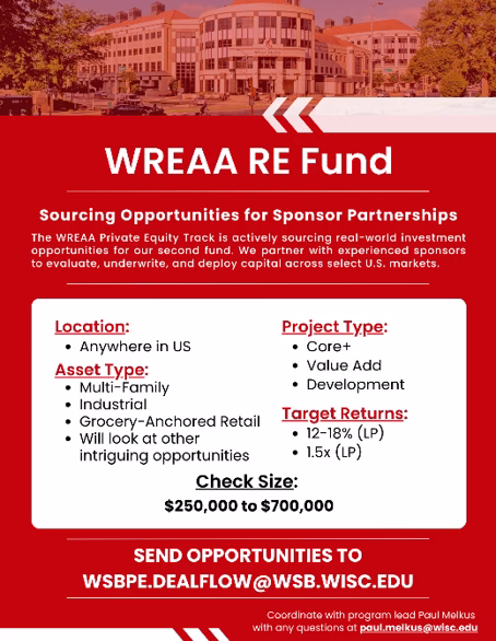 Managed by 27 graduate students in the Wisconsin School of Business’s Real Estate Private Equity (REPE) Track, WREAA Fund II represents a distinctive hands-on learning experience where students source, underwrite, and execute real-world transactions under the guidance of faculty director Paul Melkus. The fund’s capital, raised primarily from alumni and outside investors, is structured to deliver competitive real returns while advancing the Wisconsin real estate program’s commitment to experiential education.