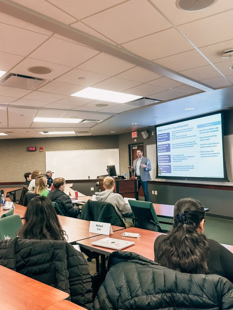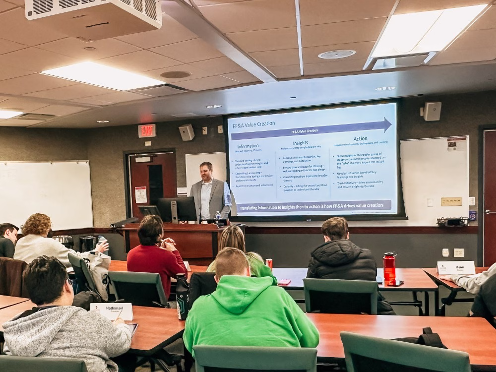 As part of our Current Topics in Finance course, the Nicholas Center for Corporate Finance and Investment Banking welcomed Chris Richard, Vice President of FP&A at TricorBraun. Chris delivered an insightful presentation on how Financial Planning & Analysis (FP&A) operates within private equity-backed companies and why the function plays a central role in value creation.
