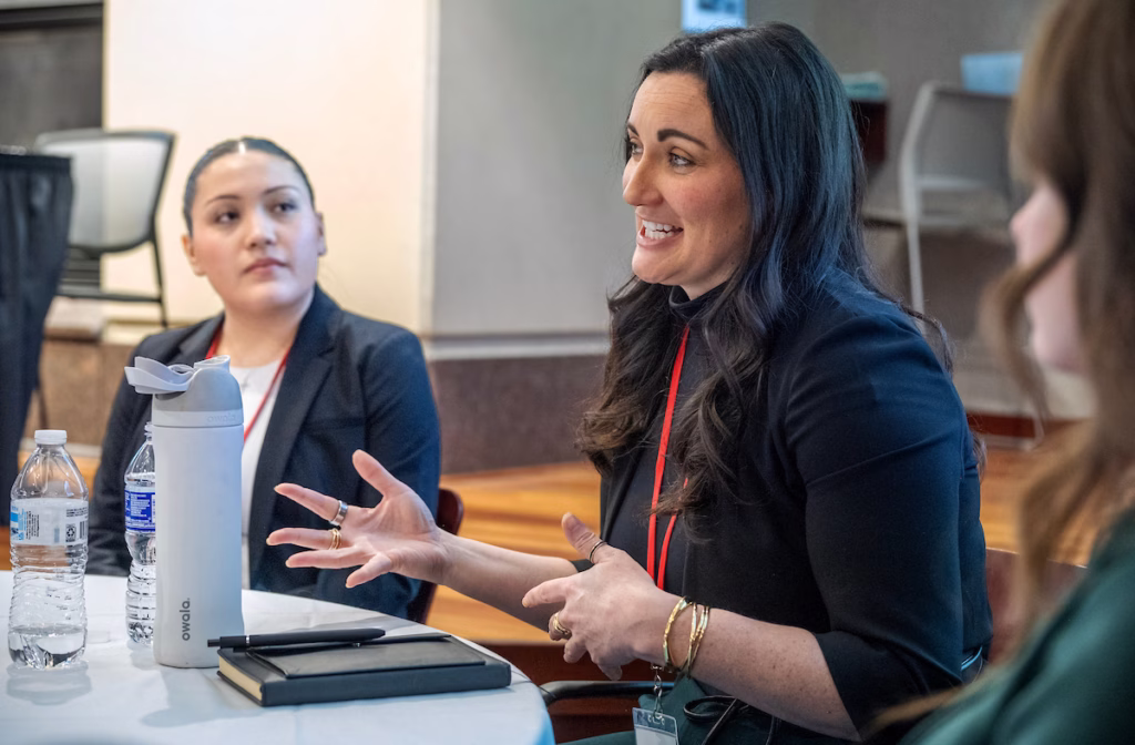 Alumna Kathyrn Kvas talks to a host of young ladies from various high schools in the area about her career during the Pre-College Girls Exploring Business event at Grainger Hall on Saturday, April 5, 2025. (Paul L. Newby, II /UW-Madison Wisconsin School of Business)