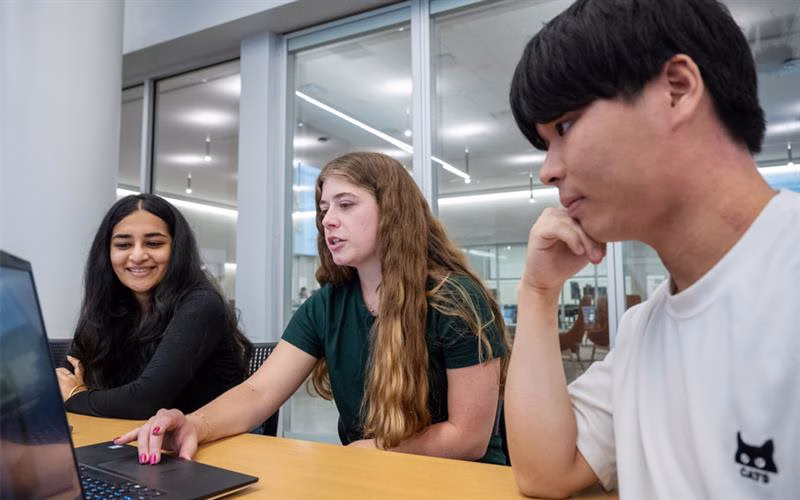 MBA student Brooke Taylor, center, works alongside her computer science teammates, Swasti Singh, left, and Minsuk You.