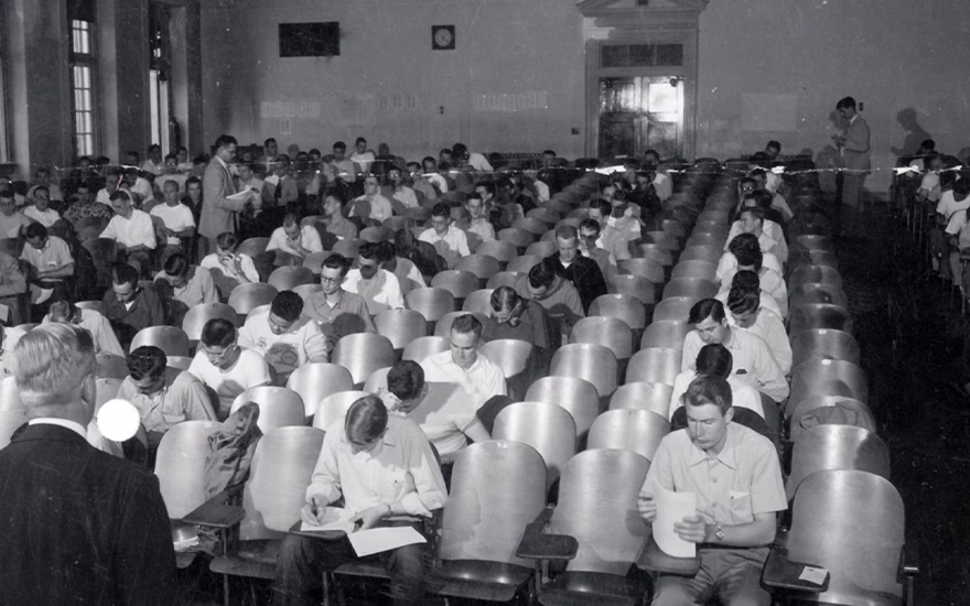 Students take a final semester exam in Professor H.Z. Kirby’s class at the UW School of Commerce in 1951. It later became the Wisconsin School of Business.
