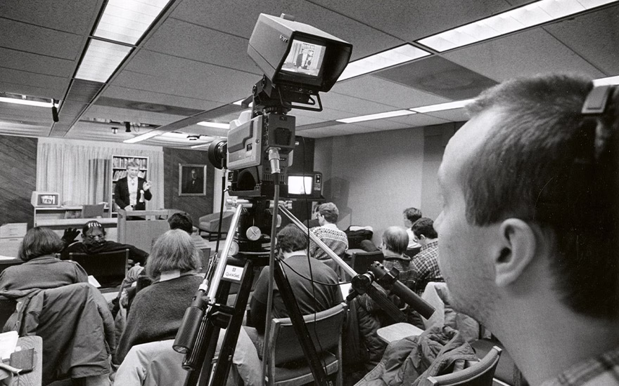 From cameraman Richard K. Willgrubs filming Professor Robert A. Haugen for a class-by-video experiment broadcast on cable TV in 1985 to 2025’s AI Hub for Business, WSB continues to pioneer innovation in business education.