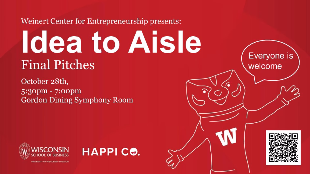 The Weinert Center for Entrepreneurship invites you to join Idea to Aisle: Final Pitches, an evening celebrating innovation, creativity, and entrepreneurial spirit at UW–Madison.