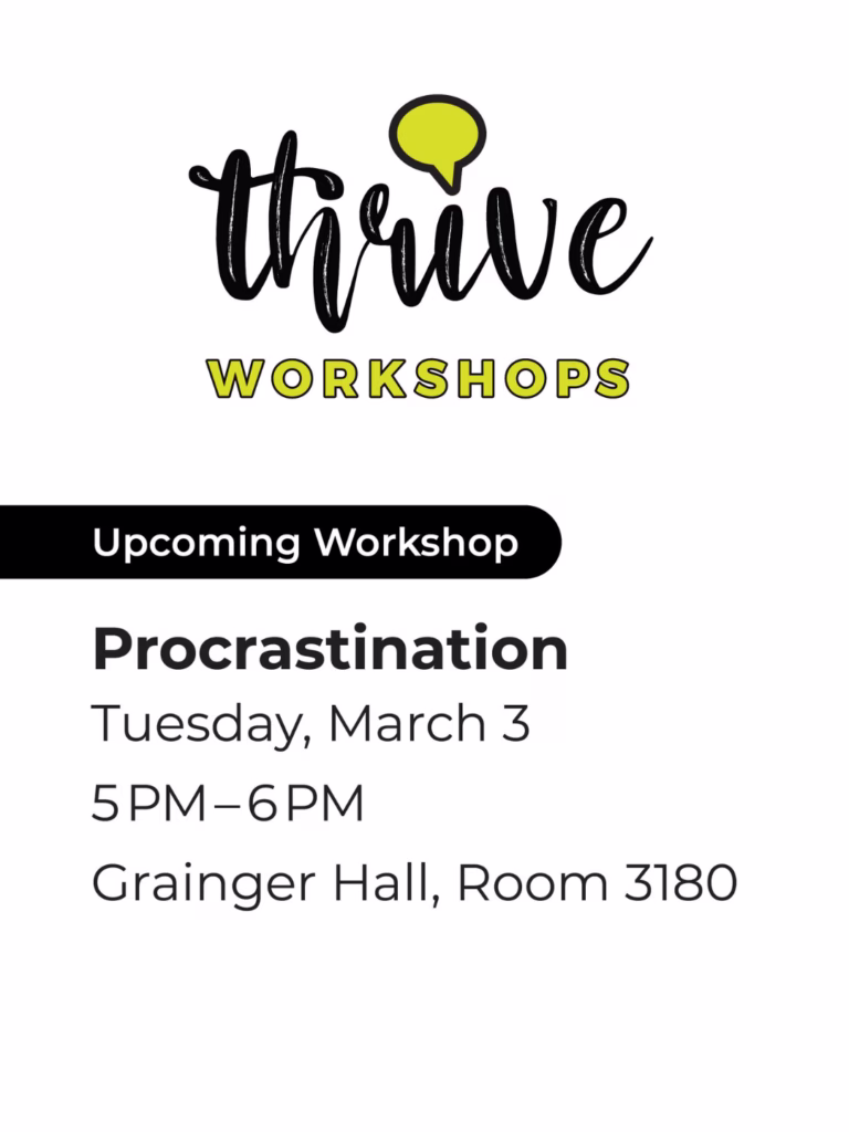 Thrive Workshop: Procrastination By Ellen Giselle Magdaleno, WSB Student Success Coach February 24, 2026 Registration Required. Can’t make it? Learn more about procrastination on Thrive Online! Tags: BBA Students Certificate in Business students Certificate in Entrepreneurship students Mental Health and Wellness Pre-Business Students